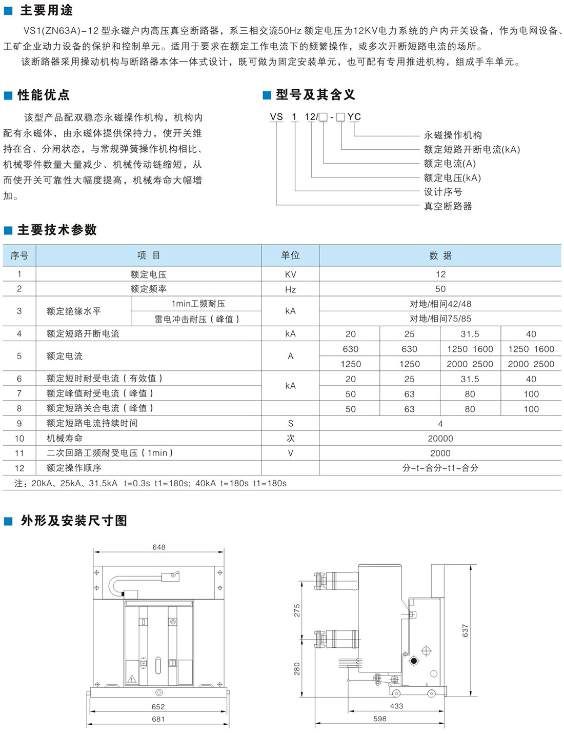 VS1(ZN63A)-12永磁户内高压真空断路器